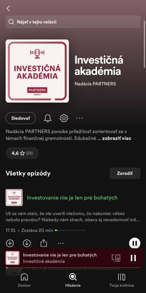 Vzdelávacie podcasty vytvára aj Nadácia Partners, a to pod názvom "Investičná akadémia". Ich podcasty sú plné aktuálnych informácií a praktických riešení zo sveta financií. Cieľom týchto podcastov je pomôcť vám urobiť správne finančné rozhodnutia.