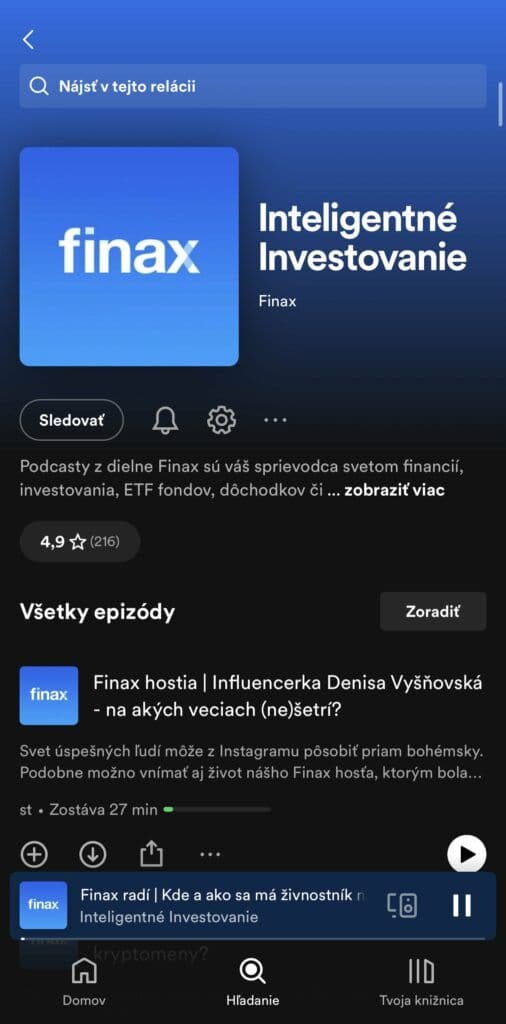 Ďalším podcastom o financiách je "Inteligentné investovanie" z dielne spoločnosti Finax. Jej podcasty sú skvelým sprievodcom vo svete financií, investovania, ETF fondov, dôchodkov, a taktiež aj finančnej gramotnosti.