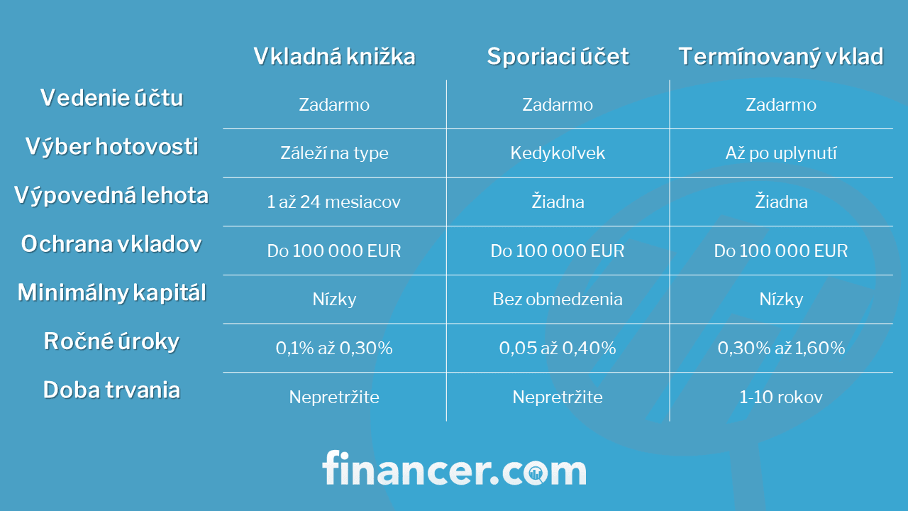 Dnes rozlišujeme tri základné druhy sporiacich účtov. Sú nimi vkladné knižky, klasické sporiace účty a termínované vklady. Vysvetlíme si, aké sú rozdiely medzi týmito formami investícií a aké výhody či nevýhody z nich plynú.