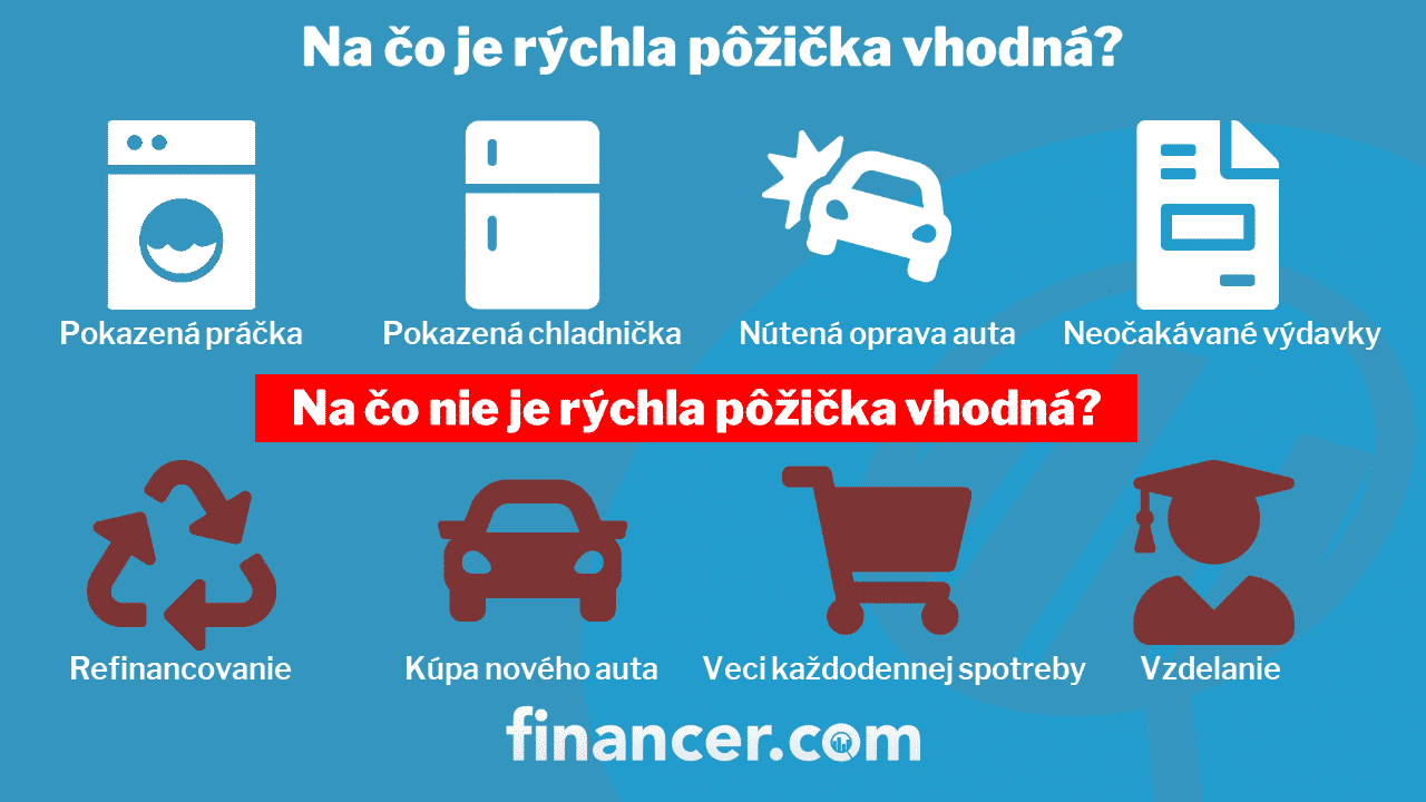 Niektorí poskytovatelia rýchlych pôžičiek vyslovene neodporúčajú žiadať o rýchlu pôžičku na nákup spotrebného tovaru. Práve naopak, odporúčajú oblasti ako: investícia do vzdelania, vodičský preukaz, darček, svadba, rekonštrukcia a iné drobné opravy či dovolenka.