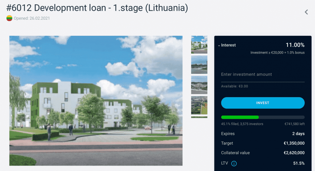 Vidíme, že máte možnosť investovať do prvej fázy takzvanej "development loan" v Litve, ktorá je dofinancovaná zatiaľ na takmer 27 % z celkovej hodnoty 1 350 000 EUR.