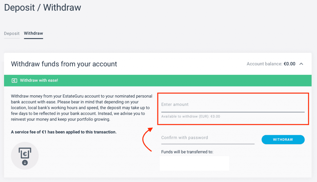 Z ľavej lišty opäť vyberiete možnosť "Deposit / Withdraw" a zvolíte možnosť výberu. Zadáte čiastku, ktorú chcete vybrať a potvrdíte túto akciu heslom.