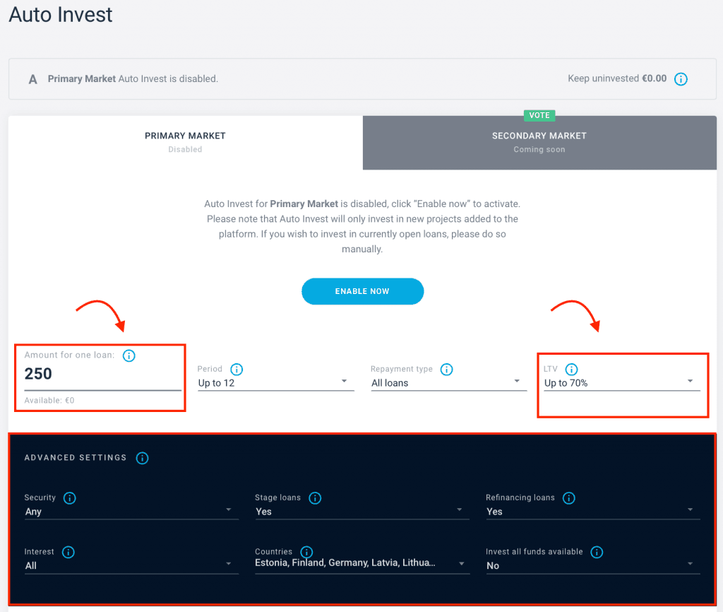 Okrem toho môžete nastaviť, že automatické investovanie sa bude spúšťať iba v prípade, ak sa na platforme objaví investícia s vami vopred určeným výnosom alebo lokalitou.