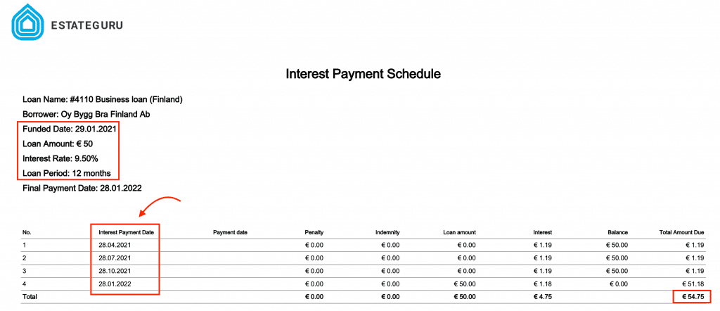 Ako vidíte, investoval som 50 EUR do nehnuteľnosti vo Fínsku so splatnosťou 12 mesiacov a ročným úrokom 9,50 %. Zároveň platí, že ide o takzvané čiastočné vyplácanie výnosov.