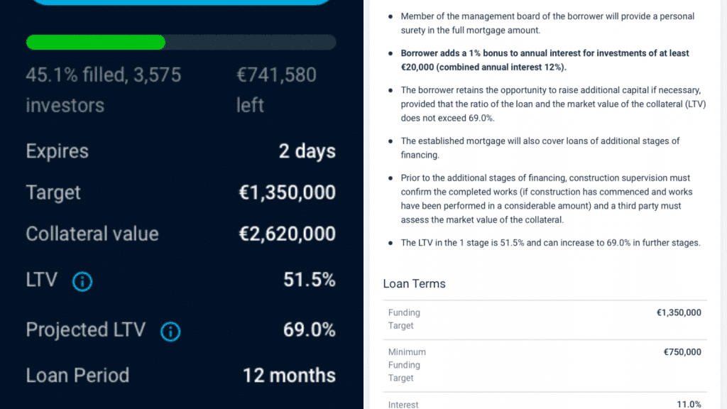 Ročný výnos tejto investície je na úrovni 11 %. Po zistení detailnejších informácii sa dozviete, že bonusové 1 % k výnosu môžete získať vtedy, ak tento projekt financujete minimálne čiastkou 20 000 EUR.