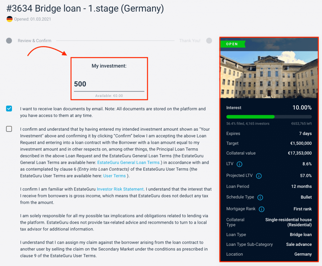 Upozorňujem, že Estateguru nie je platforma, kde by sa to hemžilo desiatkami otvorených investícií. V čase písania tejto recenzie bola dostupná jedna investícia.