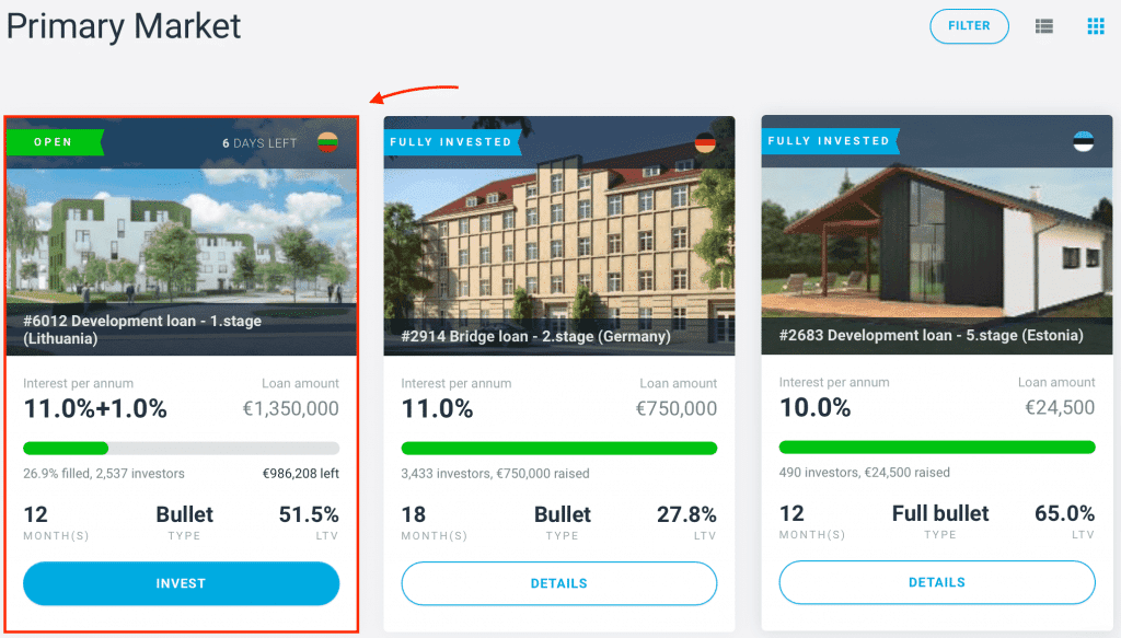 Po prihlásení máte možnosť prezrieť si aktuálne dostupné investície. V ľavej lište si vyhľadajte "Primary market". Následne uvidíte aktuálne otvorené financovania s ostatnými dôležitými detailami.