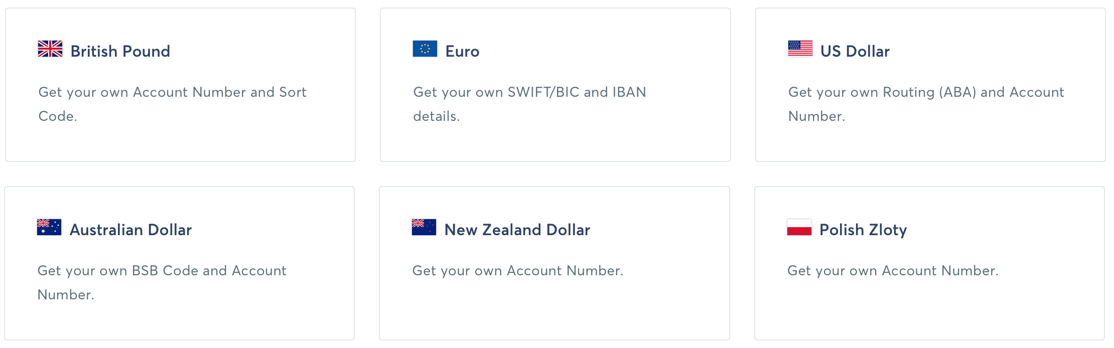 Po založení účtu získate prístup k celkovo 6 zahraničným účtom v zodpovedajúcich menách. Ku každému z nich dostanete po prihlásení vlastné údaje a vaši priatelia, ktorí majú jeden z účtov rovnaký, ich budú môcť využívať na lokálne platby bez poplatkov.