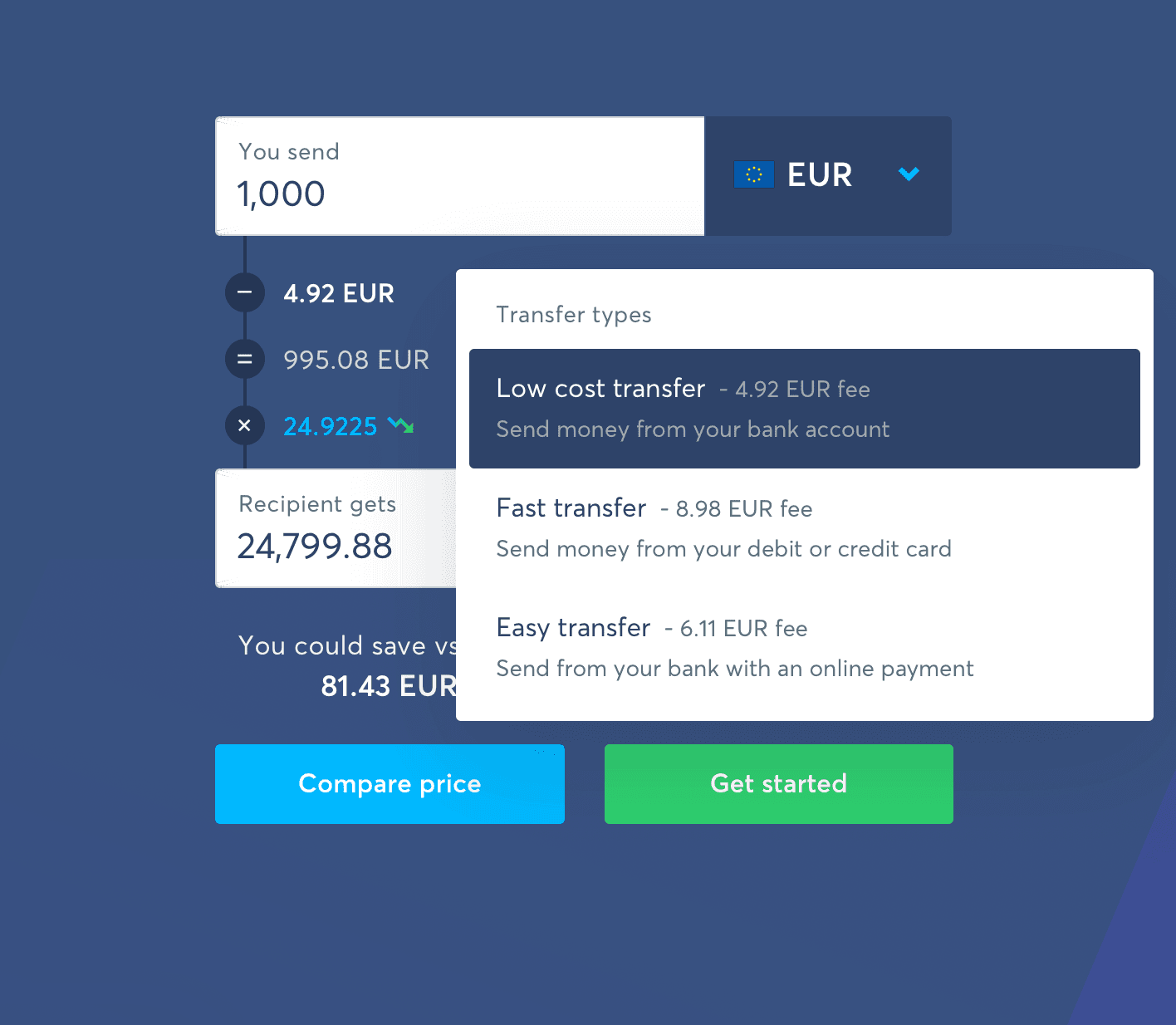 Môžeme taktiež vidieť vybraný poplatok za sprostredkovanie prevodu peňazí. Jeho výška závisí od spôsobu, akým bude účtovaný a samozrejme od sumy, ktorú prevádzate z účtu na účet. Platí, že čím vyššiu sumu prevádzate, tým je vyšší aj poplatok. My sme si vybrali najlacnejší Low cost transfer.
